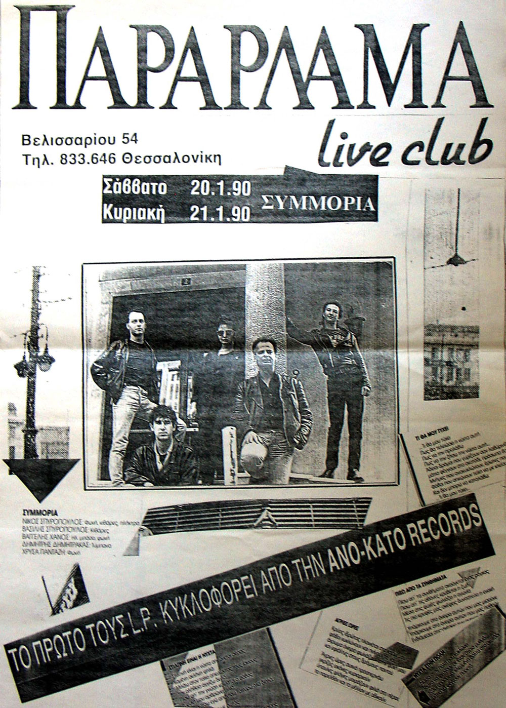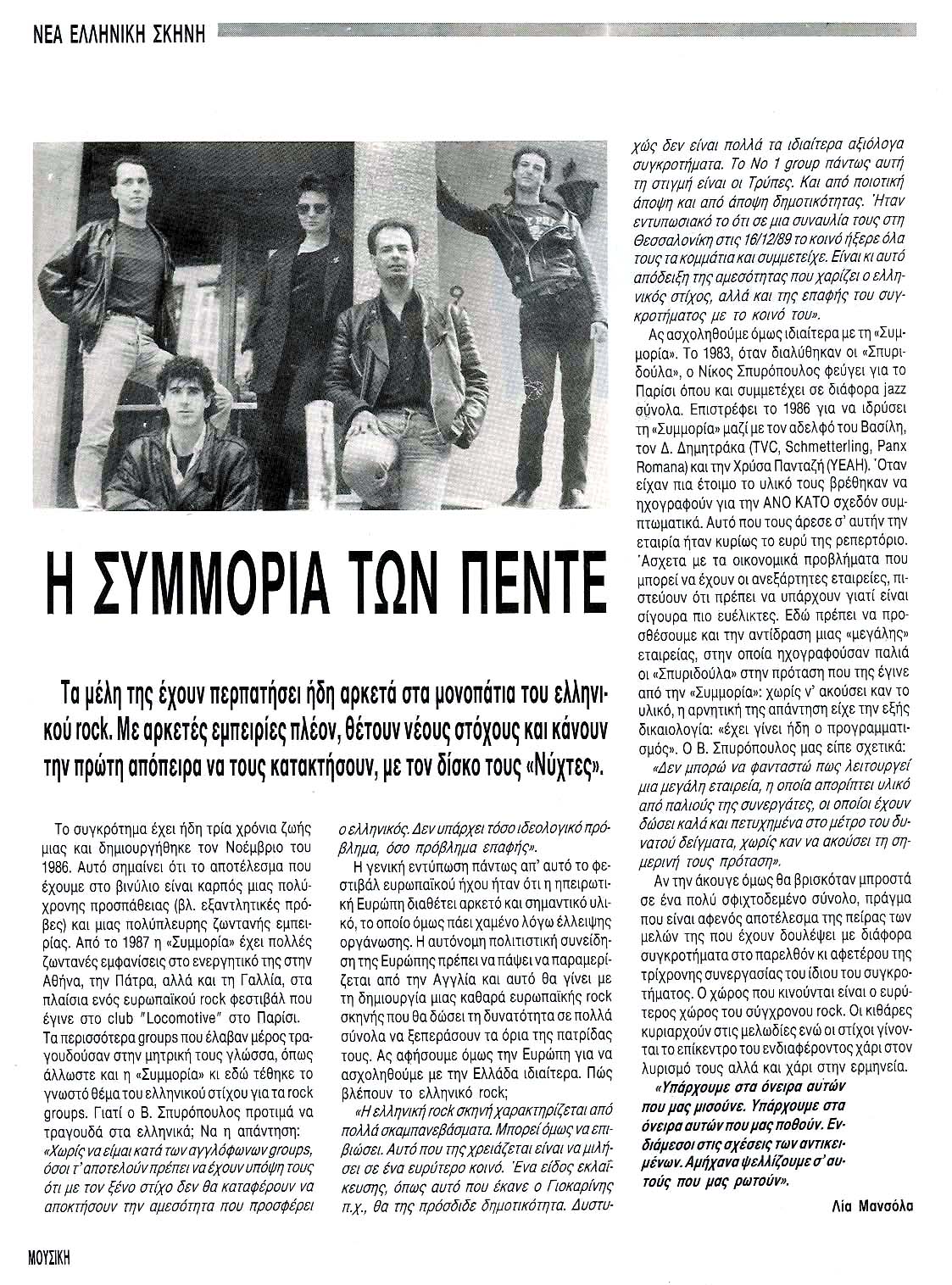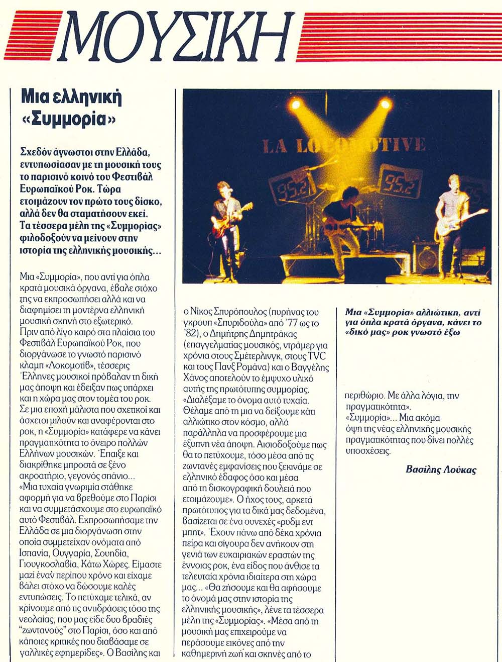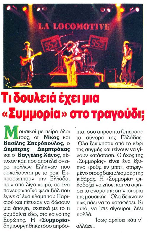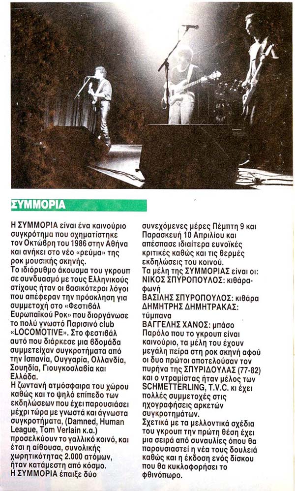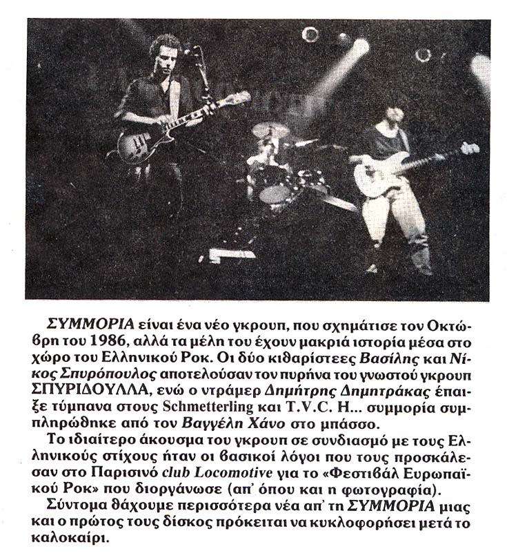 ΣυμμορίαΗ Συμμορία ήταν ένα γκρουπ που δημιουργήθηκε με καλές προϋποθέσεις από μέλη άλλων γνωστών συγκροτημάτων (Σπυριδούλα, T.V.C., Yeah!), αλλά η πορεία του δεν ήταν η αναμενόμενη, όπως και η τύχη του ενός και μοναδικού δίσκου που κυκλοφόρησε. Καλύτερη στιγμή ήταν η συμμετοχή μας στο πανευρωπαϊκό φεστιβάλ rock συγκροτημάτων στο club "La Locomotive" στο Παρίσι το 1987, αλλά αυτό δεν μας βοήθησε να συνεχίσουμε για πολύ ακόμη. Αρκετές συναυλίες, αλλά το 1990, νομίζω, διαλύσαμε.