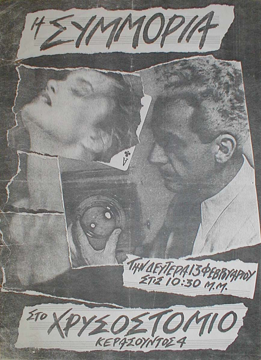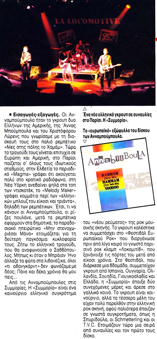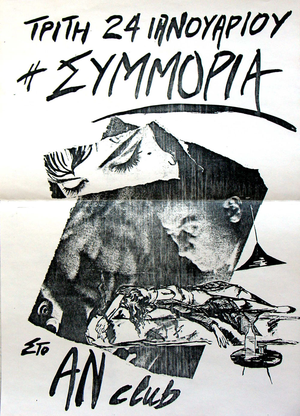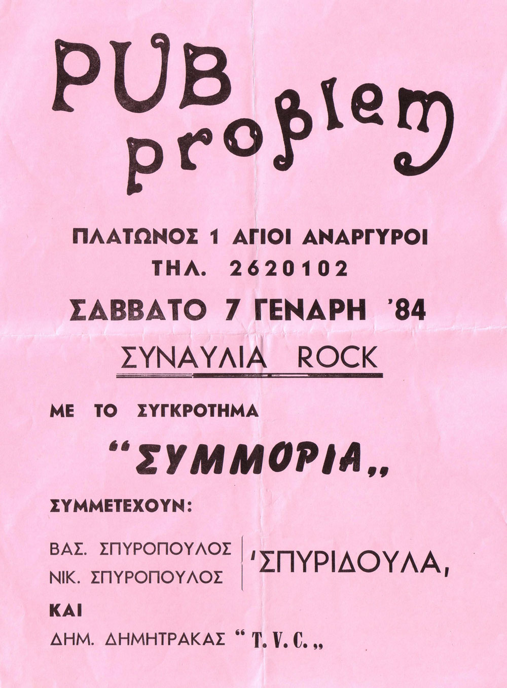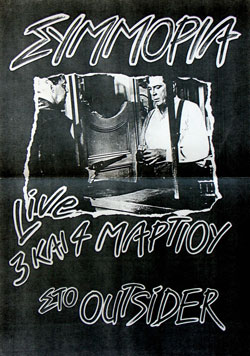 ΣυμμορίαΗ Συμμορία ήταν ένα γκρουπ που δημιουργήθηκε με καλές προϋποθέσεις από μέλη άλλων γνωστών συγκροτημάτων (Σπυριδούλα, T.V.C., Yeah!), αλλά η πορεία του δεν ήταν η αναμενόμενη, όπως και η τύχη του ενός και μοναδικού δίσκου που κυκλοφόρησε. Καλύτερη στιγμή ήταν η συμμετοχή μας στο πανευρωπαϊκό φεστιβάλ rock συγκροτημάτων στο club "La Locomotive" στο Παρίσι το 1987, αλλά αυτό δεν μας βοήθησε να συνεχίσουμε για πολύ ακόμη. Αρκετές συναυλίες, αλλά το 1990, νομίζω, διαλύσαμε.